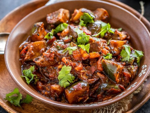 Cubes of eggplant, cooked in a rich tangy sweet and sour sauce, with special masalas, well garnished. **(Vegan, Gluten Free)**