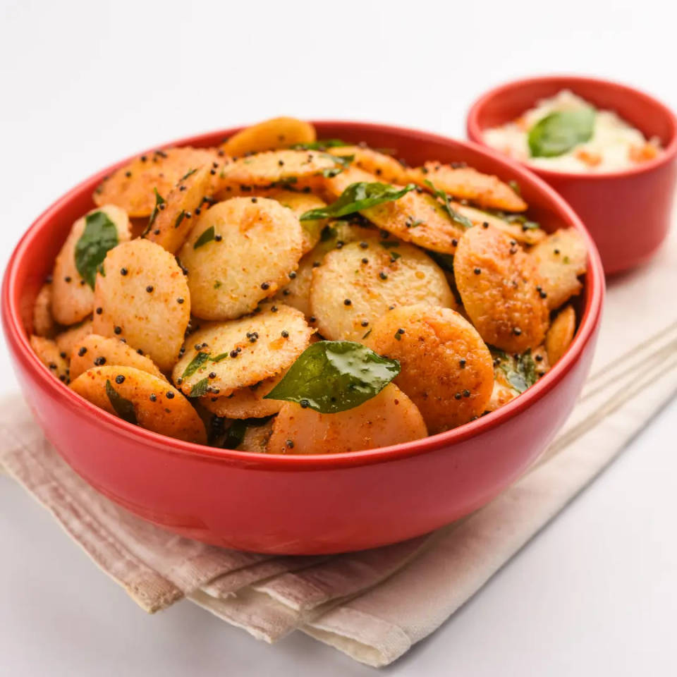 Rice and lentil cakes, cut into small pieces, sauteed with light masalas and served with coconut chutney. **(Vegan, Gluten free)**.